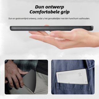 - Compact en licht (8 mm dik, 170 g) — past makkelijk in je tas of jaszak.