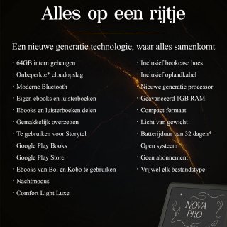 Je ontvangt alles wat je nodig hebt om direct te beginnen: een luxe bookcase-hoes, USB-C oplaadkabel, handleiding en luxe cadeauverpakking. Geen extra aanschaffen — gewoon uitpakken en lezen.
